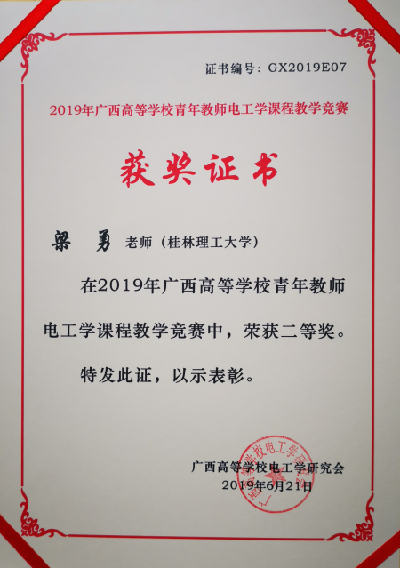 梁勇老师获奖证书
