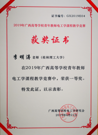 李明涛老师获奖证书