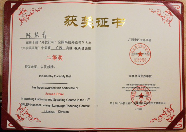 6月21至23日,第十届“外教社杯”全国高校外语教学大赛(大学英语组)广西赛区在南宁师范大学举行。Beat365官网外国语学院教师陈慧青、邢芸分别参加了大学英语听说组和综合组的比赛并获得优异成绩。