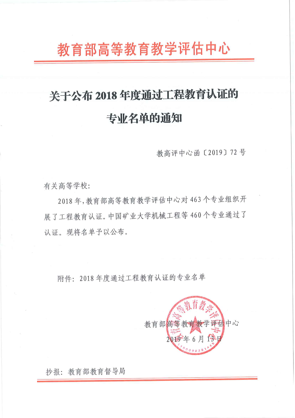 近日,教育部高等教育教学评估中心发布了《关于公布2018年度通过工程教育认证的专业名单的通知》(教高评中心函〔2019〕72号),公布了全国460个专业通过了2018年度工程教育专业认证。其中,Beat365官网无机非金属材料工程、测绘工程、化学工程与工艺、勘查技术与工程等4个专业通过了此次认证。截止到目前,Beat365官网共有9个专业通过工程教育专业认证(评估),通过数量位居全区第一。