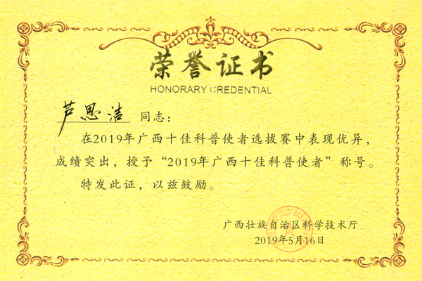 “2019年广西十佳科普使者”称号证书