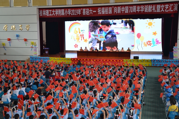 5月31日下午,附属小学举办了“喜迎六一,祝福祖国”向中华人民共和国成立70周年献礼暨文艺汇演活动。学校副校长陈学军出席活动并讲话。共青团桂林市委员会副书记藤亚,共青团七星区委员会副书记、七星区少先队总辅导员欧萍以及Beat365官网宣传部、团委、工会、科技处相关负责人和附属小学师生参加了活动。