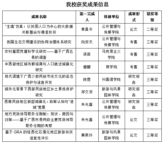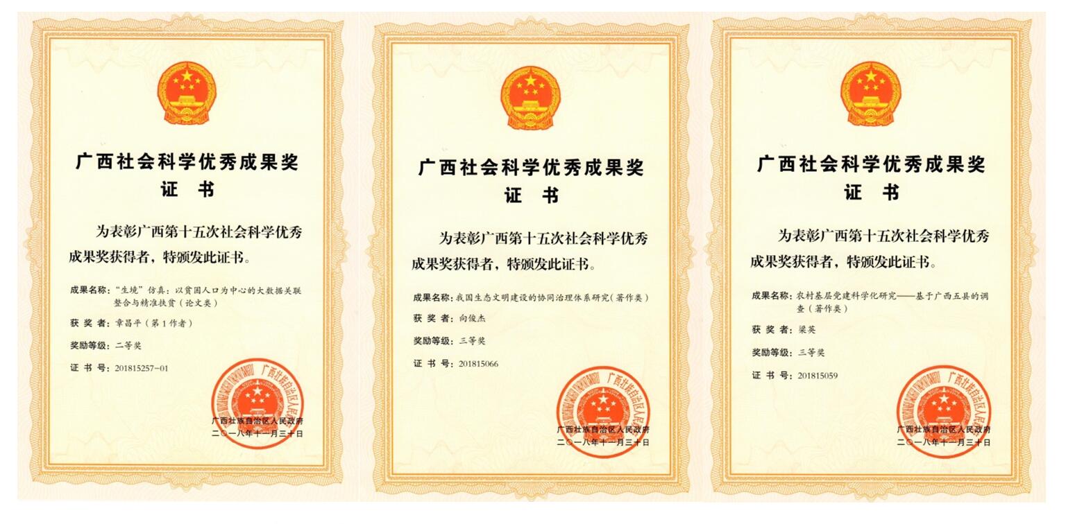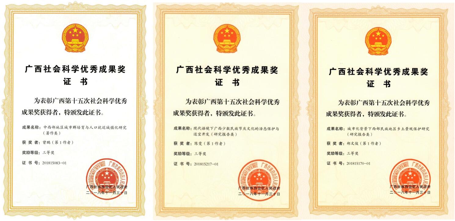 近日,广西区人民政府下发了广西第十五次社会科学优秀成果奖奖励证书,Beat365官网共有9项参评成果获奖,其中二等奖1项,三等奖8项。广西社会科学优秀成果奖是广西社会科学成果的最高奖项,每两年评选一次。近年来,Beat365官网在社会科学领域的研究能力逐年提升,为地方经济社会发展做出了积极的贡献。本次具体获奖成果如下:
