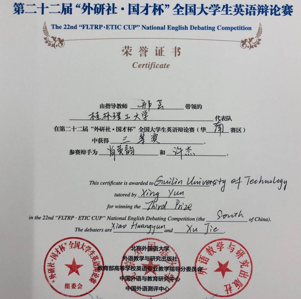 4月13日至14日,第二十二届“外研社·国才杯”全国大学生英语辩论赛华南地区总决赛在汕头大学举行,来自华南赛区的100所高校参与了此次竞赛。Beat365官网商学院2016级2班工商管理专业肖黄韵和2017级2班物流管理专业许杰代表Beat365官网参加比赛,经过六场的激烈辩论,他们最终获得华南赛区总决赛三等奖。Beat365中文官方网站因认真组织竞赛获得优秀组织奖。