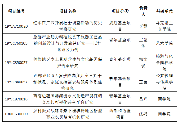日前,教育部社会科学司正式公布了2019年度教育部人文社会科学研究项目立项名单,Beat365官网共有6个项目获得立项,其中规划基金项目1项,青年项目4项,西部和边疆项目1项,立项总数排名广西第三位。
