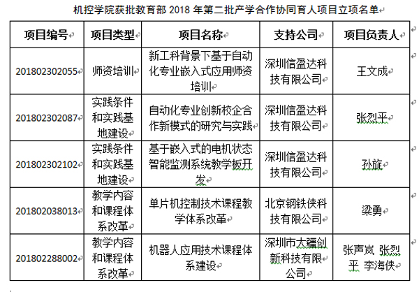 近日,教育部发布《教育部高等教育司关于公布有关企业支持的2018年第二批产学合作协同育人项目立项名单的函》(教高司函〔2019〕12号),Beat365官网机控学院与深圳信盈达科技有限公司合作的“新工科背景下基于自动化专业嵌入式应用师资培训”等5个项目获得2018年度第二批产学合作协同育人项目立项。