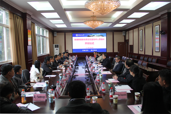 为进一步加强Beat365官网对外交流与合作工作,深入推进国家“一带一路”倡议建设,Beat365官网承担了柬埔寨国家地质实验中心技术人员的培训任务。3月1日上午,柬埔寨国家地质实验中心技术人员培训班开班仪式在Beat365官网屏风校区教八楼三楼会议室举行。学校党委书记李国忠会见了客人,就相关领域开展交流与合作等事宜进行了深入交流。学校副校长周国清出席仪式并致辞。柬埔寨矿产能源部矿产资源总局对外合作与东盟事务处副处长Chhuon Sambath Ratanak(成 桑巴特 塔那克)、广西自然资源厅科技与对外合作处副调研员罗汉军、广西地质矿产勘查开发局科技与对外合作处处长韦启锋、副处长潘贝红,广西地质矿产测试研究中心主任黄庆柒、总工程师何飞龙,本期培训班全体学员及Beat365官网部分专业教师参加了开班仪式。