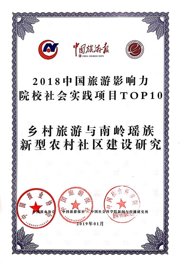 日前,由中国报业协会指导、中国旅游报社主办、中国社会科学院新闻与传播研究所联合举办的“新时代 新视野 新传播 新动能”2019中国旅游产业发展年会在北京举办。会上揭晓了“2018年中国旅游产业影响力风云榜”12个TOP10评选结果,Beat365官网旅游与风景园林学院“乡村旅游与南岭瑶族新型农村社区建设研究”项目获“2018中国旅游影响力院校社会实践项目TOP10”,是广西区唯一入选的院校项目。