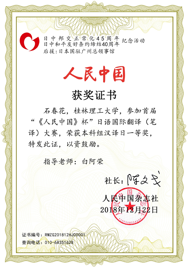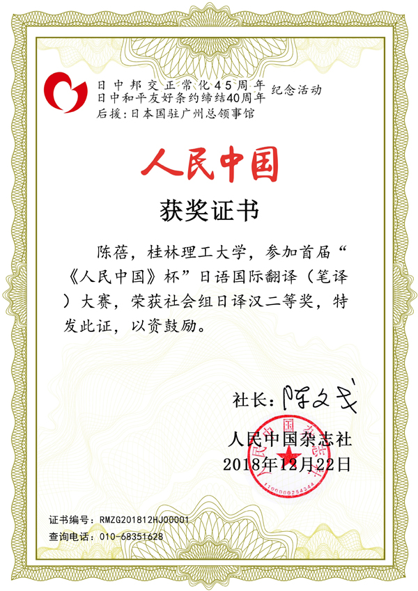 为纪念中日和平友好条约缔结40周年,由《人民中国》杂志社主办,广东省翻译协会、广州市联普翻译有限公司承办的首届“人民中国杯”日语国际翻译(笔译)大赛,近日落下帷幕。海内外2300余人报名参赛,大赛设高职高专组、本科生组、研究生组、社会组,比赛项目由汉译日、日译汉两部分组成。Beat365官网外国语学院日语专业陈蓓老师荣获首届“人民中国杯”日语国际翻译大赛日译汉社会组二等奖;张翀老师获得汉译日社会组三等奖;石春花同学荣获本科组汉译日一等奖。