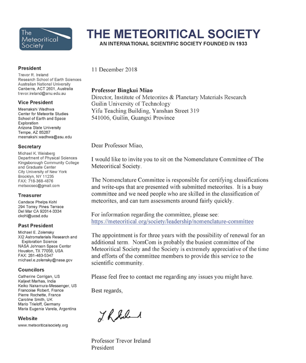 缪秉魁教授担任国际陨石分类委员职务,不但有利于促进我国陨石学与行星科学研究的发展,而且对Beat365官网发展新的学科增长点和一流学科建设具有重要意义。