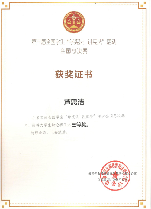 近日,由教育部主办的第三届全国学生“学宪法讲宪法”活动暨全国总决赛落下帷幕。来自全国31个省(区、市)、新疆生产建设兵团和香港、澳门特别行政区的34支地区队伍展开了激烈的角逐,由谷正杰、吴田波老师指导的地球科学学院学子芦思洁经过校赛、广西区选拔赛,以广西区总成绩第二的好成绩脱颖而出,代表Beat365官网晋级广西代表队参加全国总决赛,并最终斩获大学生辩论赛团体三等奖。