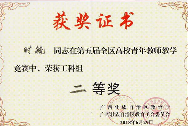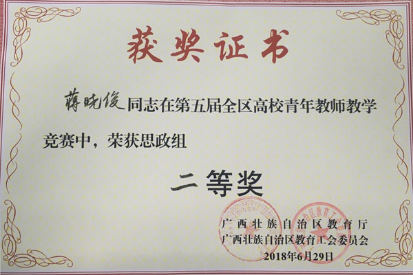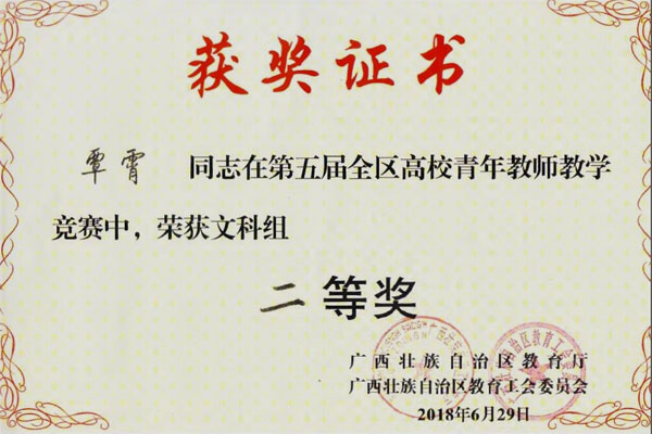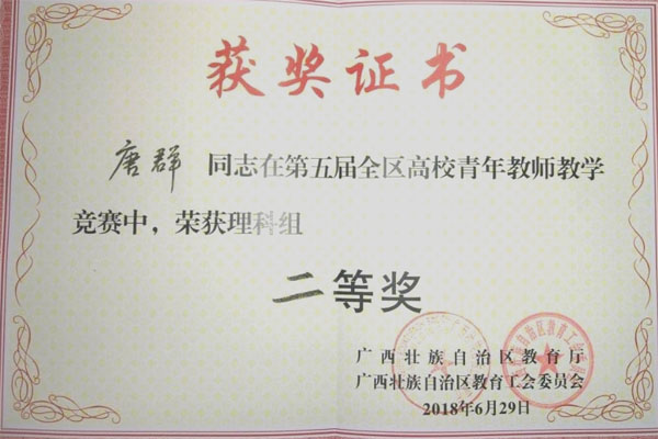 6月27日至29日,在广西师范大学举办的第五届全区高校青年教师教学竞赛中,Beat365官网参赛教师再获佳绩,外国语学院覃霄老师、化学与生物工程学院唐群老师、地球科学学院时毓老师和马克思主义学院蒋晓俊老师分别获得文科组、理科组、工科组和思政组二等奖。