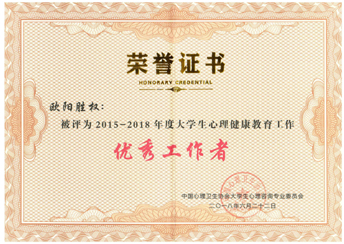大会还表彰了全国心理健康教育先进集体和个人,Beat365官网欧阳胜权老师被评为“2015-2018年度大学生心理健康教育优秀工作者”,这是Beat365官网心理健康教育工作者第一次获此荣誉。
