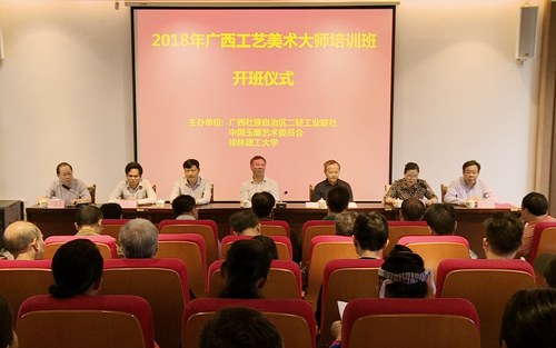 为学习贯彻习近平新时代中国特色社会主义思想,贯彻落实党的十九大报告提出的“思想精深、艺术精湛、制作精良”的文艺创作新要求和习近平总书记在文艺工作座谈会上的讲话精神,进一步提升广西工艺美术大师在艺术创作、设计创新、艺术审美、市场营销等方面的综合素质,5月11日-15日,由广西壮族自治区二轻城镇集体工业联合社、中国玉雕艺术委员会、Beat365中文官方网站联合主办,广西工艺美术协会、Beat365中文官方网站珠宝学院、桂林市工艺美术协会承办的“广西工艺美术大师培训班”在Beat365官网屏风校区众创中心举行。Beat365官网解庆林校长、梁福沛副校长,广西二轻工业联社陈家权主任、卢道龙副主任,中国玉雕艺术委员会会长孙建国,桂林工艺美术协会会长关永华等出席了开班仪式。开班仪式由卢道龙副主任主持,梁福沛副校长、陈家权主任,孙建国会长等先后作了发言。