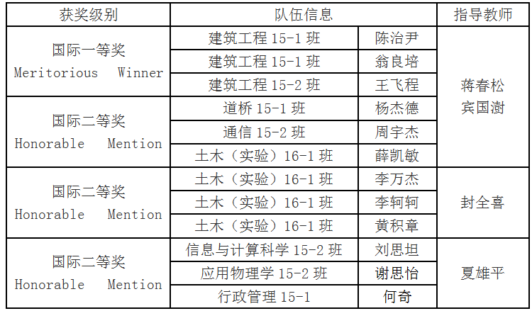 2018年美国大学生数学建模竞赛Beat365官网获奖队伍信息如下: