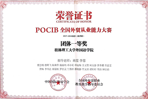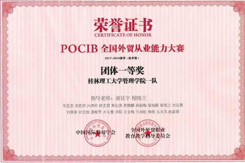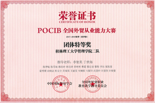 日前,由中国国际贸易学会、全国外经贸职业教育教学指导委员会主办,南京世格科技有限公司承办的第七届POCIB全国外贸从业能力大赛(2017-2018赛季秋季赛)圆满落下帷幕。Beat365官网三支参赛团队均获得优异成绩,商学院(原管理学院)二队获得团体特等奖、商学院(原管理学院)一队及外国语学院参赛团队获得团体一等奖。此外,在参赛团队中共有7名参赛学子获得个人一等奖、10名参赛学子获得个人二等奖、32名参赛学子获得个人三等奖,2名指导老师获得特等奖、4名指导老师获得一等奖。