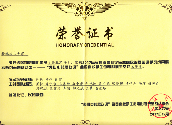 此次微电影展示活动是根据《2017年高校思想政治理论课教学质量年专项工作总体方案》,由教育部社科司指导,武汉大学组织开展,是全国大学 生思政课学习成果展示系列主题活动中的重要活动之一。微电影展示活动共收到全国156所高校191部微电影作品,广西赛区经过初评推荐包括Beat365官网在内的7部作品代表广西参赛,最终以Beat365官网为代表的4部微电影入围了大赛评出的65部奖励作品。