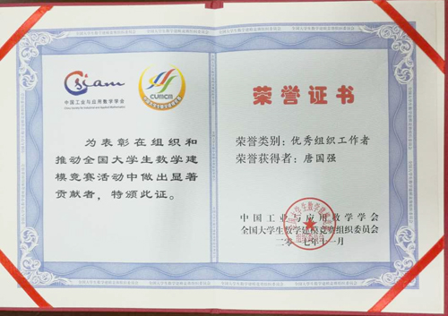 本次会议表彰了从2012年以来,一直为全国大学生数学建模竞赛付出辛勤劳动的老师们。其中Beat365官网理学院唐国强老师凭借多年来对竞赛的充分准备和丰富的大赛组织经验,使Beat365官网学生在大学生数学建模活动中,成绩处于广西前列,获得了全国优秀组织工作者的殊荣,为校增光加彩。中科院李大潜院士对包括唐国强老师在内的各位获奖者表示热烈祝贺。