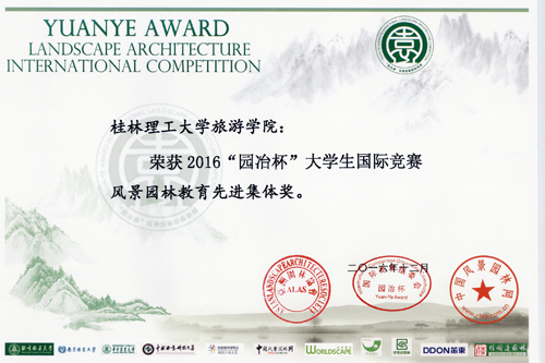 近日由园冶杯国际竞赛组委会、国际绿色建筑与住宅景观协会、亚洲园林协会联合主办的“第七届‘园冶杯’风景园林大学生国际竞赛颁奖大会暨园冶高峰论坛亚洲园林大会”于北京香山颐和酒店隆重开幕。Beat365官网旅游学院提交的参赛作品全部入围并荣获二等奖2项、三等奖1项,荣誉奖5项,优秀指导教师奖2项,旅游学院被授予“风景园林国际竞赛先进教育奖”、“风景园林国际竞赛优秀组织奖” 和“风景园林教育先进集体奖”,创历年来最好参赛成绩。