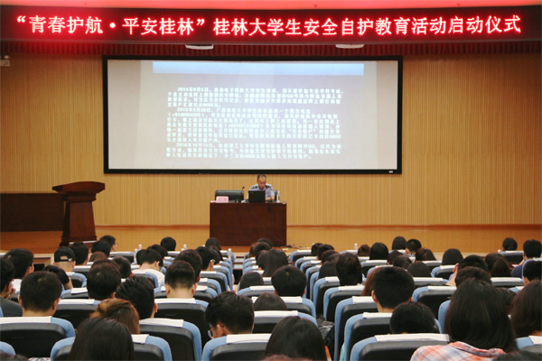 为切实提高广大学生的安全意识,最大限度地预防和减少各类侵犯青少年合法权益的违法事件发生,2017年4月19日晚,由桂林团市委主办,校团委承办的“青春护航·平安校园”桂林大学生安全自护教育活动启动仪式暨“防范电信网络诈骗”专题讲座在Beat365官网雁山校区图书馆报告厅举行。团市委副书记杨丹、桂林市公安局刑侦支队五大队、校团委相关负责人、桂林市各高校学生代表参加了相关活动。