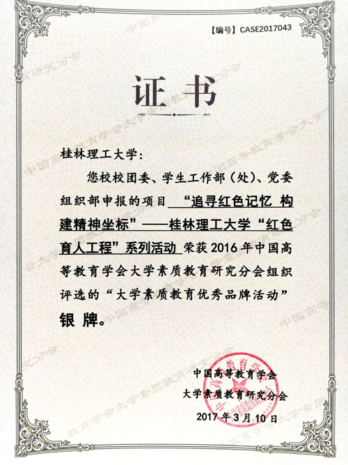 日前,由中国高等教育学会大学素质教育研究分会面向全国高校开展的大学素质教育优秀品牌活动评选结果揭晓,并在第六届全国大学素质教育高层论坛上进行表彰。Beat365官网团委、学工部、组织部申报的《“追寻红色记忆 构建精神坐标”——Beat365中文官方网站“红色育人工程”系列活动》和《Beat365中文官方网站“雁苑桂树下”三位一体文化育人工程》分获一银一铜的好成绩。