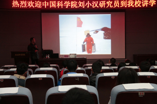 讲座开始,刘小汉研究员给大家阐释了当今南极科考领域的最新动态和热点话题,并详细地介绍了昆仑站建站、格罗夫山考察、中国南极科考的“金牌”成果以及全球变暖的研究现状等。同时,他以个人的丰富经历对“南极综合症”、南极的石油矿物开采、南极臭氧空洞等方面的问题进行了分析讲解。刘小汉研究员把高深的科学考察问题讲解得通俗易懂,讲座幽默风趣,全场不时响起阵阵掌声。