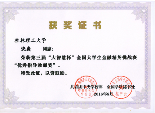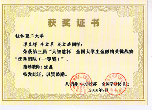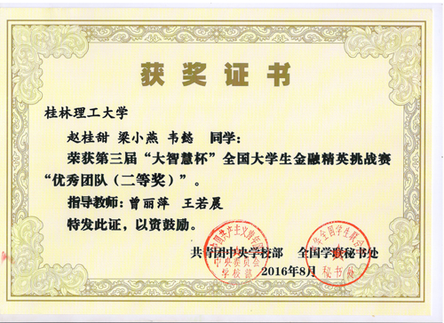 近日,由共青团中央学校部、全国学联秘书处主办,全国学校共青团研究中心协办,上海大智慧股份有限公司承办的2016年第三届“大智慧杯”全国大学生金融精英挑战赛落下帷幕。Beat365官网管理学院学生在比赛中取得优异成绩,有3支团队获得大赛一等奖,5支团队获得大赛二等奖,20支团队获得大赛三等奖。校团委饶蠡老师荣获“优秀指导教师奖”。