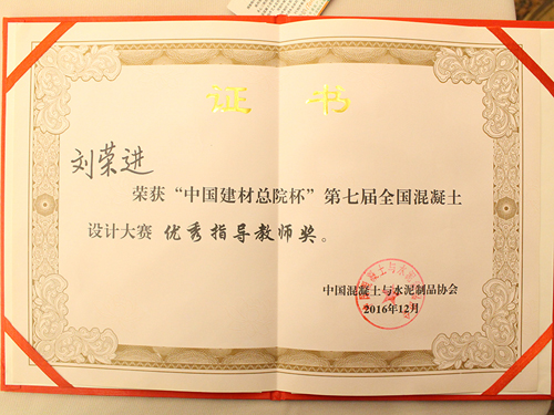刘荣进老师荣获“中国建材总院杯”第七届全国混凝土设计大赛优秀指导老师