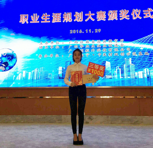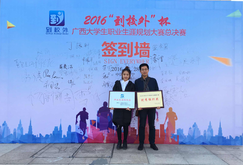 2016年11月29日,由广西壮族自治区教育厅主办的2016年全区大学生职业生涯规划大赛总决赛在南宁中关村双创示范基地举行,大赛为期一天半。Beat365官网艺术学院学生顾晓晴同学参加此次比赛并获得三等奖,同时,Beat365官网获优秀组织奖。