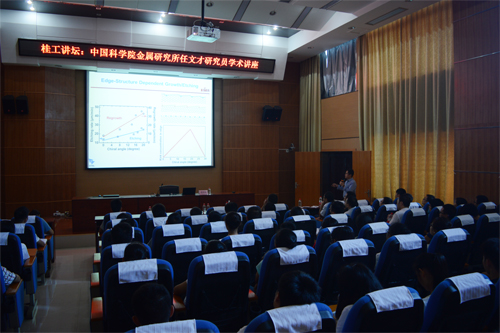 10月28日下午,应理学院邀请,中国科学院金属研究所研究员、科技部中青年科技创新领军人才入选者任文才研究员做客桂工讲坛,在雁山校区萃华楼报告厅作了题为“石墨烯材料:从制备到应用”的精彩讲座。讲座由理学院副院长张富文教授主持,理学院应用物理专业师生参加了此次学术讲座。 任文才研究员对石墨烯材料制备中存在的基本问题进行了概述,指出了CVD方法生长大面积石墨烯面临的主要挑战之一是如何实现从金属基底高质量转移石墨烯薄膜以及金属基底的循环利用,给出了通过阴极电离快速剥落石墨烯薄膜的方案,并对其优越性进行了详细分析。另外,任文才研究员还介绍了其课题组在规模制备高质量石墨烯粉体方面的最新成果及其产业化方面的进展,分享了他们勤奋工作做出高水平研究的心得,并对现场师生提出的问题进行了幽默风趣的解答。