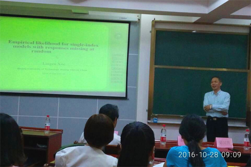 10月28日上午,应理学院邀请,北京工业大学博士生导师薛留根教授和程维虎教授,同济大学博士生导师梁汉营教授做客桂工讲坛,在屏风校区7411教室分别做了题为“随机缺失响应下单指标模型的经验似然估计”、“广义Logistics分布的统计推断及其应用”和“协变量缺失情形下的分位数回归模型的惩罚经验似然估计”的学术报告。报告会由理学院院长助理张浩敏主持,我院相关专业师生到场聆听了此次讲座。 薛留根教授在报告中着重介绍了响应随机缺失下单指标模型指标系数的估计问题,基于经验似然方法和正态逼近方法得到了指标系数的分布性质的一系列结果并通过统计模拟和实际数据验证了正态逼近方法的优势。 程维虎教授用风趣幽默的语言深入浅出地介绍了广义Logistic分布的参数估计问题,利用广义矩估计和偏L-矩估计两种方法对I型广义Logistic分布的参数进行估计并研究了估计的性质。最后通过模拟研究说明了理论结果。 梁汉营教授在报告中主要研究了协变量在随机缺失情形下线性分位数回归模型参数的经验似然和惩罚经验似然估计;进一步,对总体部分辅助信息已知的情形,通过加权方法来构造参数的经验似然和惩罚经验似然估计;最后,通过模拟对不同方法进行了对比。 三位教授的精彩报告赢得了在场师生们的阵阵热烈掌声,拓宽了师生们的学科视野,提升了师生们对学科前沿发展动态的把握,对Beat365官网统计学学科发展和研究生培养等都有很强的指导意义。