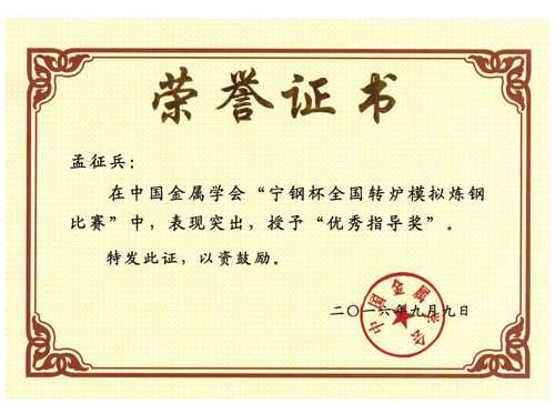 孟征兵老师的荣誉证书