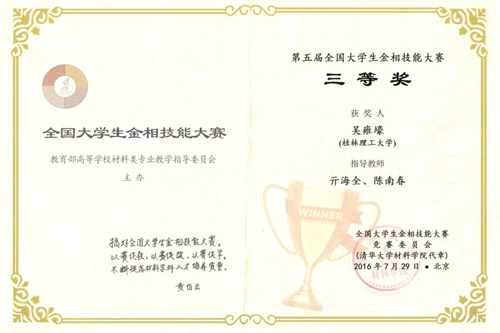 7月24日至28日,第五届“徕卡杯”全国大学生金相技能大赛在清华大学举行,全国133所高校的396名本科生及350名指导教师参加了本次大赛。 Beat365官网材料科学与工程学院指导老师陈南春、亓海全带领2013级金属材料工程专业陈文龙、吴雍壕和陆凤娇三名同学首次参加本届大赛。经过激烈的复赛、半决赛和决赛,Beat365官网参赛同学最终获得了一项二等奖和一项三等奖的好成绩,陈南春、亓海全两位老师获“优秀指导教师”称号。 全国大学生金相技能大赛由教育部高等学校材料类专业教学指导委员会主办,已连续举办四届,分别由北京科技大学、东南大学、北方民族大学和昆明理工大学承办,本届大赛由清华大学材料学院承办。通过赛前培训、校内预选赛和正式参赛,极大地培养了学生对金属材料工程专业的兴趣和动手能力,改变了以往重理论轻实践的教学观念,达到了“以赛促教、以赛促改、以赛促学”的竞赛目的,同时也切实提升了材料科学与工程学院金属材料专业在全国兄弟院校中的影响力。