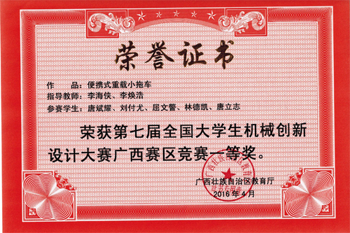 4月15日-17日,由广西壮族自治区教育厅主办,广西大学承办的第七届全国大学生机械创新设计大赛广西赛区比赛在广西大学举行。本届比赛共有24个高校代表队的222件参赛作品参与了本次比赛的角逐。经过专家组的认真评审,Beat365官网机械与控制工程学院参赛代表队共获得1个一等奖,4个二等奖和4个三等奖的好成绩,并获得了本届比赛的优秀组织奖。近日自治区教育厅对获奖单位和获奖个人进行了表彰。 全国大学生机械创新设计大赛是经教育部高等教育司批准,由教育部高等学校机械学科教学指导委员会主办,机械基础课程教学指导分委员会、全国机械原理教学研究会、全国机械设计教学研究会、北京中教仪科技有限公司联合著名高校共同承办,面向大学生的群众性科技活动。全国机械创新设计大赛的目的在于培养学生综合设计能力与协作精神,加强学生动手能力和工程实践的训练,提高学生针对实际需求进行机械创新、设计、制作的实践工作能力,吸引、鼓励广大学生踊跃参加课外科技活动,为优秀人才脱颖而出创造条件。 第七届全国大学生机械创新设计大赛的主题为“服务社会——高效、便利、个性化”,内容为“钱币的分类、清点、整理机械装置;不同材质、形状和尺寸商品的包装机械装置;商品载运及助力机械装置”。Beat365官网高度重视本次大赛,在学校教务处的大力支持下,机械与控制工程学院进行了充分的赛前动员,积极组织学生参赛,并精心安排指导教师指导学生认真备赛完成作品,最终在比赛中获得佳绩。以下是各代表队所获得的奖项: