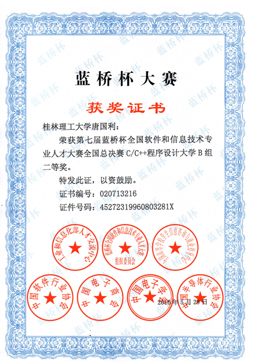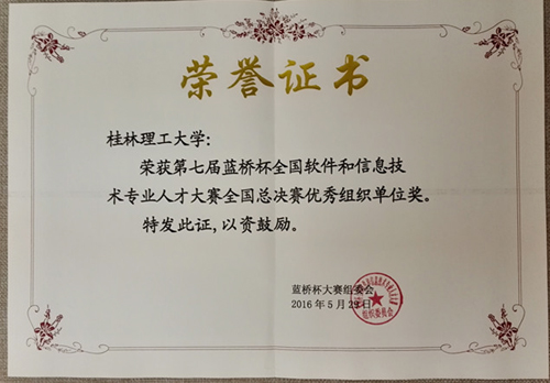 2016年5月28日至29日,第七届“蓝桥杯”全国软件和信息技术专业人才大赛全国总决赛在北京隆重举行。经过校内和广西赛区选拔,代表学校参加全国总决赛的4名同学共获全国二等奖1项,三等奖2项。其中信息学院计算机科学与技术专业2014级唐国利同学获得C/C++程序设计本科组全国二等奖,计算机科学与技术专业2013级李会雄同学(国际留学生)和网络工程专业2013级的郑正鹏同学获C/C++程序设计本科组全国三等奖。此外,Beat365官网因在赛事组织工作上的突出表现,再次荣获全国总决赛优秀组织单位奖和广西赛区优胜学校奖,这是Beat365官网连续五年获得此类荣誉。 本次大赛由工业和信息化部人才交流中心、教育部全国高等学校学生信息咨询与就业指导中心联合主办,全国参赛高校达到1200多所,参赛选手达3.5万余名。