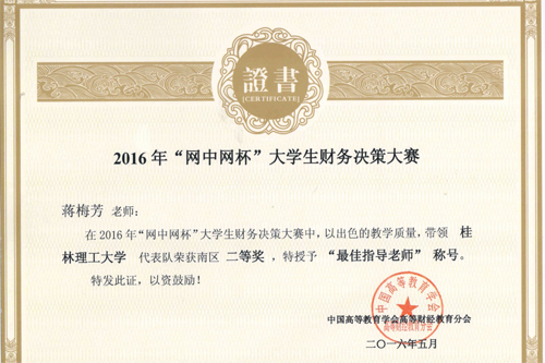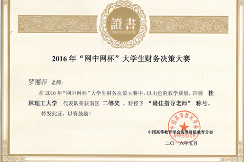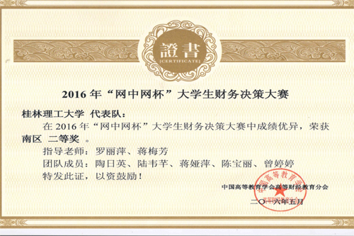 由中国高等教育学会高等财经教育分会主办,厦门网中网软件有限公司、厦门网中网财务技术有限公司联合承办的2016年度“网中网杯”大学生财务决策大赛于2016年5月29日圆满结束,全国分六个大区进行,南区大赛覆盖了福建、广东、广西、海南、江西五个省区的高等院校。Beat365官网管理学院会计专业学生陶日英、陆韦芊、蒋娅萍、陈宝丽、曾婷婷五位学生代表学校参加了比赛,在罗丽萍、蒋梅芳老师指导下,取得南区二等奖,广西参赛院校中排名第一。两位指导老师被授予“最佳指导老师称号”。 大赛采取团队竞赛模式,从一名财务总监CFO的角度去审视企业的运营、财务、管理、涉税等多项企业活动,从而在企业实操过程中锻炼学生的决策能力、风险管控能力、税收筹划能力、团队协作能力。比赛过程中他们在模拟的工业企业里,综合运用市场营销、人力资源、生产运作管理、财务管理、会计、税务筹划等学科知识,在财务决策平台中做好生产决策、投产发货、日常作账、月末结转、季末报税等各项工作。在2天的激烈比赛中,五位参赛选手以科学严谨、追求卓越的精神完成任务,顺利完成了企业三个月运作中的各项工作。 Beat365官网会计学子首次参加该项比赛能取得较好成绩,充分展示了Beat365官网会计学专业学生的会计信息应用能力、决策能力、创新能力,激发大学生的创新、实践热情,对提高学生专业知识应用能力起到了良好的促进作用。