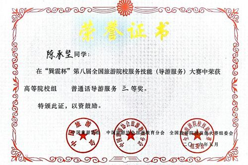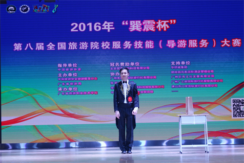 由中国旅游协会旅游教育分会和广东省旅游局联合主办的“巽震杯”第八届全国旅游院校服务技能(导游服务)大赛于5月12日至15日在广东旅游职业技术学校举行。大赛展示了近年来我国旅游专业建设的成果,为旅游院校和社会各界搭建了交流的平台,受到社会各界广泛关注。 Beat365官网旅游学院贺剑武、王志文、黄小华三位老师担任教练和领队带领旅游学院杨瑒、李子豪、孙文强、陈丽敏四位学生出赛,历时三天的紧张比赛中,Beat365官网选手不畏强手,凭借扎实的专业功底和良好的综合素质获得佳绩,其中杨瑒同学获最佳解说奖及三等奖,李子豪同学获最佳才艺奖及优胜奖,孙文强、陈丽敏两位同学均获得优胜奖。此外,南宁分校经济与管理系学生陈承坚、龚磊和王博潇也参加了此项赛事,并分别获得中文组三等奖、中文组优胜奖和英文组优胜奖。 在整个大赛赛程中,来自335所高等院校和中职学校的956名选手完成理论考核、导游讲解和才艺展示,以良好的专业能力和气质风采给各界留下了深刻的印象。大赛观摩超过3万人次,为我国旅游界和社会各界提供了良好的交流平台。
