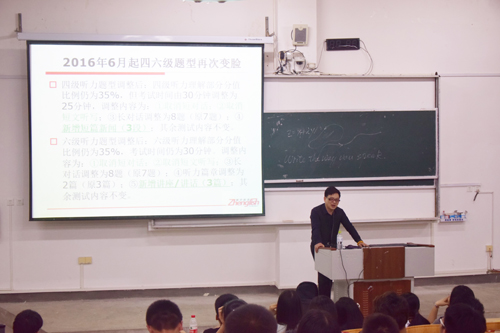 5月9日至10日,应外国语学院邀请,振宇英语创始人、英语测试学专家方振宇老师就“新形势下大学英语教学与四级备考”以及“新形势下大学英语四级改革题型分析与应试策略”两个主题,面向Beat365官网师生做了三场专题讲座。 在讲座中,方振宇老师回顾了大学英语四级考试近30年的发展历程及其特点,并就大学英语四六级考试的未来发展趋势做了预测。他结合具体的例子,着重对四级考试题型变化趋势、题源、新四级各模块的解题技巧等进行了分析。 在与教师的交流中,方老师还专门就“我们是否了解自己的学生?我们需要怎样的课堂?我们需要怎样的考试辅导?我们需要怎样的课后监管?我们是功利教学还是全面提高?我们是否有一揽子解决方案?”等几个问题提出了自己的观点。 各场讲座都座无虚席,反响热烈。到场的师生都表示受益匪浅。此次系列讲座将对Beat365官网进一步营造浓厚的英语学习氛围,提升大学英语教学水平产生积极的作用。