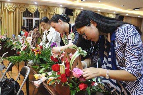 女教职工现场制作插花