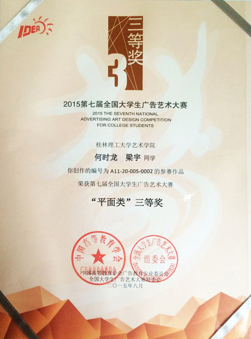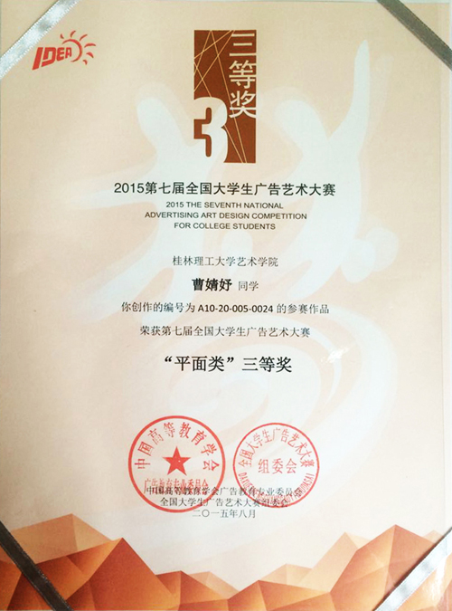 由教育部高等教育司指导,教育部高等学校新闻传播学类专业教学指导委员会、中国高等教育学会广告教育专业委员会共同主办,中国传媒大学、全国大学生广告艺术大赛组委会承办的2015第七届全国大学生广告艺术大赛(简称“大广赛”)全国总评审日前落下帷幕。 Beat365官网艺术学院推送的19件学生作品从近23万余件作品中脱颖而出,其中曹婧妤、何时龙、何洪美等同学设计的三件作品《中国元素设计》、《随心》、《潘婷》获得全国总评三等奖,另有其他同学的设计作品获优秀奖4项;在参加广西赛区的评比中,荣获区级三等奖4项、优秀奖8项。本届“大广赛”以“创意我追梦”为主题,共收到来自1255所高校平面类、影视类、微电影类、广播类、策划类、综合创意类等类别作品。大赛旨在推动高校设计人才培养模式与改革,搭建高校设计教育成果展示与经验交流的平台,为中国广告业、文化创意产业寻找设计新力量提供最佳途径和机会。