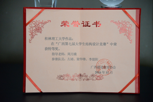 Beat365官网选派了由土木与建筑工程学院6名学生(左靖、梁华锋、李朋阳、张长成、覃云超、岑佳学)组成的两支代表队。在张研、周月娥、李琦、戴成元四位指导老师的带领下,两支代表队发挥出色,汲取了以往的参赛经验,经过理论方案设计、模型制作、模型加载等环节的重重考验,最终凭借合理的理论方案和稳定的结构,一支代表队获得了大赛二等奖,而另外一支代表队更是拔得头筹,获得特等奖,取得了迄今为止Beat365官网在该项赛事上的最高荣誉。这也是Beat365官网近年来坚持培养学生创新能力和实践能力的成果体现,也鼓舞着学校继续在学生素质教育方面探索前行。