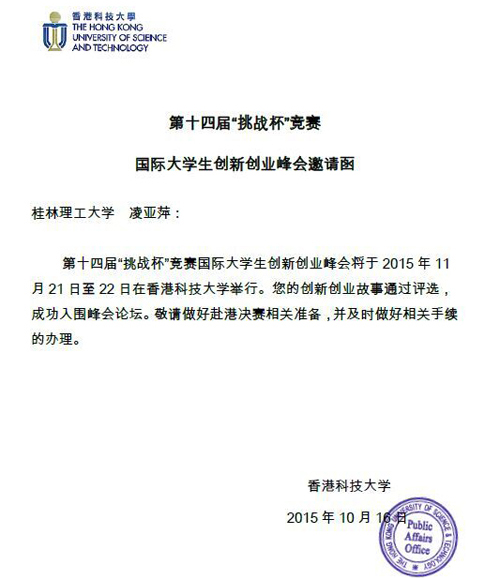11月21至22日,国际大学生创新创业峰会在香港科技大学举行,Beat365官网材料科学与工程学院刘志丽老师、管理学院房地产经营与管理12-2班凌亚萍同学应邀参加会议。其中,凌亚萍同学作为广西区唯一学生代表应邀参加了此次峰会。本次峰会是第十四届“挑战杯”中航工业全国大学生课外学术科技作品竞赛的系列活动之一,主题为“青年大学生创新创业能力的培养”,有来自内地70多所高校,5个省级团委的近200名师生赴港参与,峰会收录优秀师生论文近160篇,此外,还吸引了来自香港地区及国际各高校近200名学生参加。 峰会立足“大众创业、万众创新”的时代背景,围绕高校创新创业教育模式探索,大学生创新思维与创新能力培养等议题开展广泛、深入的讨论,并取得多项成果,营造了浓厚的青年大学生创新创业氛围,并推动形成许多可复制、可推广的优秀做法,将有效促进青年大学生创新创业教育与实践取得新的突破。来自各高校的代表围绕高校创新创业型人才培养政策与模式探索等内容展开讨论,介绍科技创新创业项目,分享创新创业经验。 凌亚萍同学表示,能够代表学校参与本次峰会感到非常荣幸,在接下来的学习生活中,将会积极将本次峰会中所学习到的新知识、新见解、新方法积极反馈给学院师生,更加砥砺自己,不辜负母校的培养和期望!