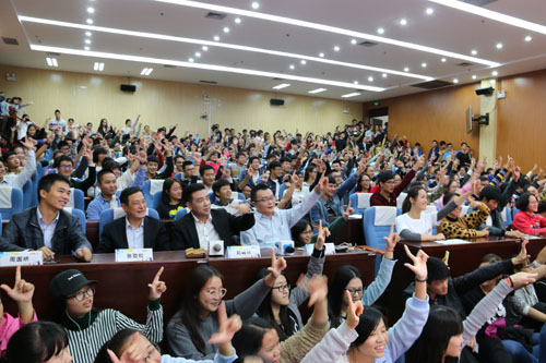 互动环节,两位导师分别对Beat365官网大学生创新创业基地“三维虚拟旅游平台”、“百应团移动互联平台”、“桂林本地生活化自媒体项目——桂林人不知道的桂林事儿”三个创业项目以及大学生志愿者协会的“Glove阳光助残公益活动”进行了点评和指导。现场同学们与两位导师通过微信提问、现场问答等进行了热烈互动,场上幸运观众还获赠了杨澜女士的亲笔签名书籍一本。
