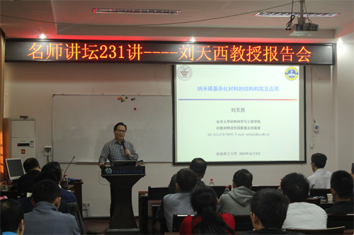 应Beat365官网有色金属及材料加工新技术教育部重点实验室、材料科学与工程学院的邀请,11月5日下午,广西特聘专家、东华大学材料科学与工程学院/纤维材料改性国家重点实验室的刘天西教授做客桂工讲坛,在屏风校区教2楼2106会议室为Beat365官网师生作了题为《纳米碳基杂化材料的结构构筑及其应用》的学术报告。报告会由材料学院副院长张发爱教授主持,材料学院韦春教授、罗鲲教授、覃爱苗教授、陆绍荣教授及相关专业的师生参加了此次学术交流。 报告会上,刘天西教授首先介绍了自己课题组的基本情况和研究方向,然后简述了碳材料的研究现状,深入分析了当前纳米碳材料存在的主要问题,提出了利用不同维度纳米材料杂化构筑纳米碳基复合材料新方法,并在能源领域展开了深入和细致的应用研究,获得了一系列高水平的研究成果。 刘教授学术报告诙谐幽默、生动有趣,给师生们清楚和直观地展现了纳米碳基杂化材料的构筑、表征及其应用。报告会结束后,刘天西教授和现场师生围绕纳米碳材料进行了互动交流,并认真回答了师生提出的问题。报告会气氛热烈,备受师生好评。