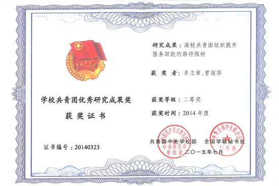 日前,共青团中央公布了2014年度全国学校共青团优秀研究成果获奖名单,Beat365官网共青团研究成果《高校共青团组织提升服务职能的路径探析》(作者:辛立章、曾丽萍)荣获二等奖。 近年来,为推进新常态下学校共青团工作创新发展,形成“全团抓研究”的生动局面,在学校党委的领导下,学校各级共青团组织结合青年学生需求,不断提升服务职能,深入调查研究,加强团的基层组织建设。积极探索服务青年学生的工作路径,建立完善的服务体系,提升服务青年学生的综合能力。围绕青年思想引领和成长成才开展了一系列卓有成效的研究与实践,取得了一定成效。