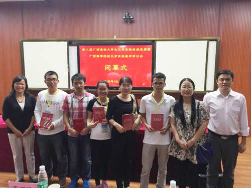 10月24、25日,由广西教育厅主办、广西大学承办的 “第八届广西高校大学生化学实验技能竞赛”顺利举行。来自全区26所高校的104名同学参与了此次大赛。经过两天紧张激烈的角逐,Beat365官网化学与生物工程学院4名参赛同学均取得了优异成绩:张有全同学荣获一等奖,曾令闯、李志娟、宁崇良同学荣获二等奖。同时,张秀清老师获优秀指导教师奖。 赛前,Beat365官网各级领导高度重视,多次召开动员会,给参赛同学加油鼓劲,参赛同学在指导教师精心指导下认真备赛。比赛过程中,选手们充分发扬顽强拼搏精神,细心操作,相互鼓励,展示了桂工学子风范,赢得了兄弟院校的一致好评,为学校争得了荣誉。