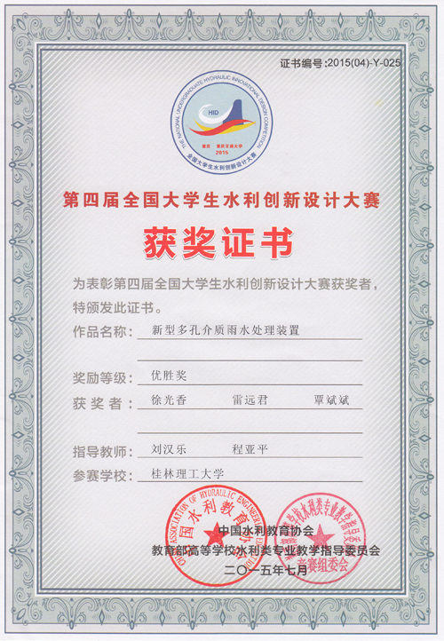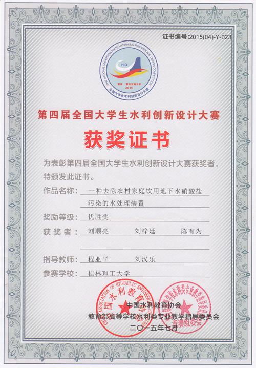 7月29至31日,由中国水利教育协会、教育部高等学校水利类专业教学指导委员会共同主办的2015年第四届全国大学生水利创新设计大赛在重庆交通大学举行。来自清华大学、同济大学、武汉大学、东华理工大学等全国69所高校的175件水利创新作品、近千名师生参加了角逐。Beat365官网选派由环境科学与工程学院程亚平老师指导刘顺亮、陈有为、刘梓廷同学完成的作品《一种去除农村家庭饮用地下水硝酸盐污染的水处理装置》和刘汉乐老师指导徐光香、雷远君、覃斌斌同学完成的作品《新型多孔介质雨水处理装置》均荣获优胜奖。 全国大学生水利创新设计大赛是全国水利类大学生的“奥林匹克”竞赛。每两年举办一届,旨在激励水利类专业本科学生踊跃参加创新实践训练,在实训中培养协作精神、创新意识和实践能力,为我国水利事业建设和发展培养一批创新型人才。本次大赛以“高效用水”为主题,内容涵盖水的利用、水安全、水处理、节约用水等,注重节水优先、强化保护、系统治理、人水和谐的可持续发展理念。 Beat365官网参赛作品《一种去除农村家庭饮用地下水硝酸盐污染的水处理装置》和《新型多孔介质雨水处理装置》在环境学院5月份举办的全校选拔赛中脱颖而出,获得代表学校参加全国比赛的资格,并历经近3个月时间的精心打磨、不断完善,最终荣获全国优胜奖。此次获奖对于进一步激发水利类专业学生学习的积极性、培养学生创新创业能力、推动Beat365官网水利类专业的教学改革、提升专业人才培养质量具有重要意义。