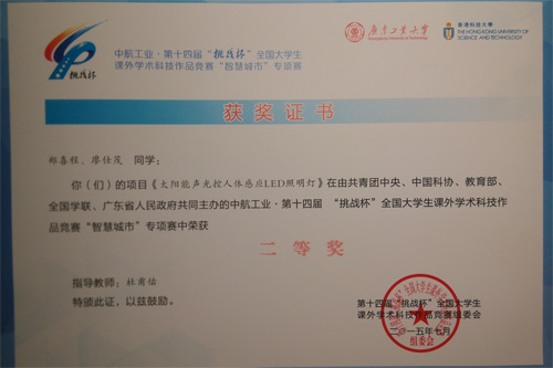 本届大赛共有通过资格审核的境内申报作品807件,经过专家评审,30件作品进入决赛。Beat365官网化学与生物工程学院郑喜程、廖仕茂等同学的作品《太阳能声光控人体感应LED照明灯》进入决赛(广西高校唯一),赴香港参加决赛答辩,并荣获二等奖。该作品由化生学院杜甫佑教授指导。