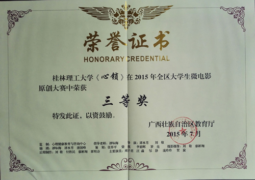 7月10日,2015年全区大学生微电影原创大赛优秀作品展播暨经验交流会在广西财经学院召开,本次会议由广西壮族自治区教育厅主办,广西普通高校大学生心理健康教育教学指导委员会协办,旨在促进各高校大学生微电影剧组的相互沟通学习,有效发挥作品成果的教育作用。 会上表彰了2015年全区大学生微电影原创大赛优秀作品,Beat365官网选送的两部微电影《寻》和《心锁》从全区145部参赛作品中脱颖而出,分别获得二等奖和三等奖,并以总分排名第四的成绩获得“优秀组织奖”,杨剑和谭咏梅老师被评为“优秀指导老师”。