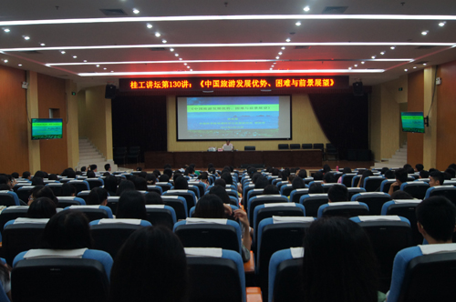 6月15日上午,中科院地理科学与资源研究所郭来喜研究员在雁山图书馆报告厅为旅游学院师生作了题为《中国旅游发展优势、困难与前景展望》的专场报告。 郭来喜研究员首先从中国远古到现代发生的相关事件引出了“中国是世界旅游最早发展之国”的观点,然后用他渊博的知识、独到的见解从中国旅游发展优势、中国旅游发展之难题、中国旅游发展前景观望等三个方面进行了精辟阐述,他还鼓励大家要学习再学习,合理利用时间多读书,努力向旅游行业高层次人才行列发展。郭来喜研究员深入浅出的授课方式,赢得场下掌声不断,师生们收获颇丰。